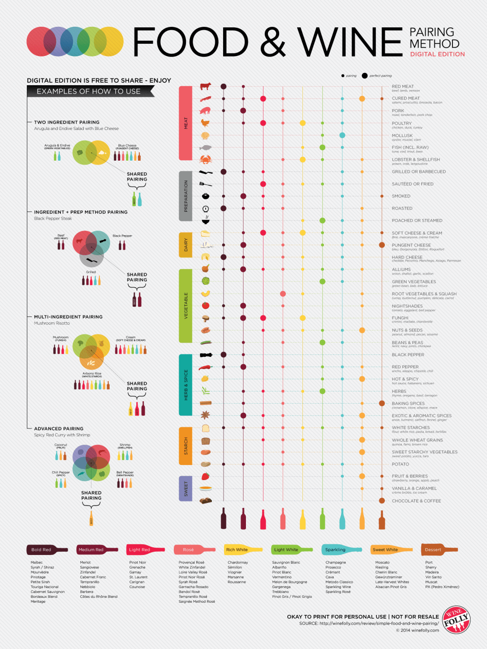 Finalmente, Wine Folly nos obsequia una referencia completa (en inglés) sobre cómo maridar según los tipos de vino (tinto intenso, tinto ligero, rosé, blanco, espumante y dulce) y de alimentos (carnes, quesos, vegetales, especias, almidones y postres):